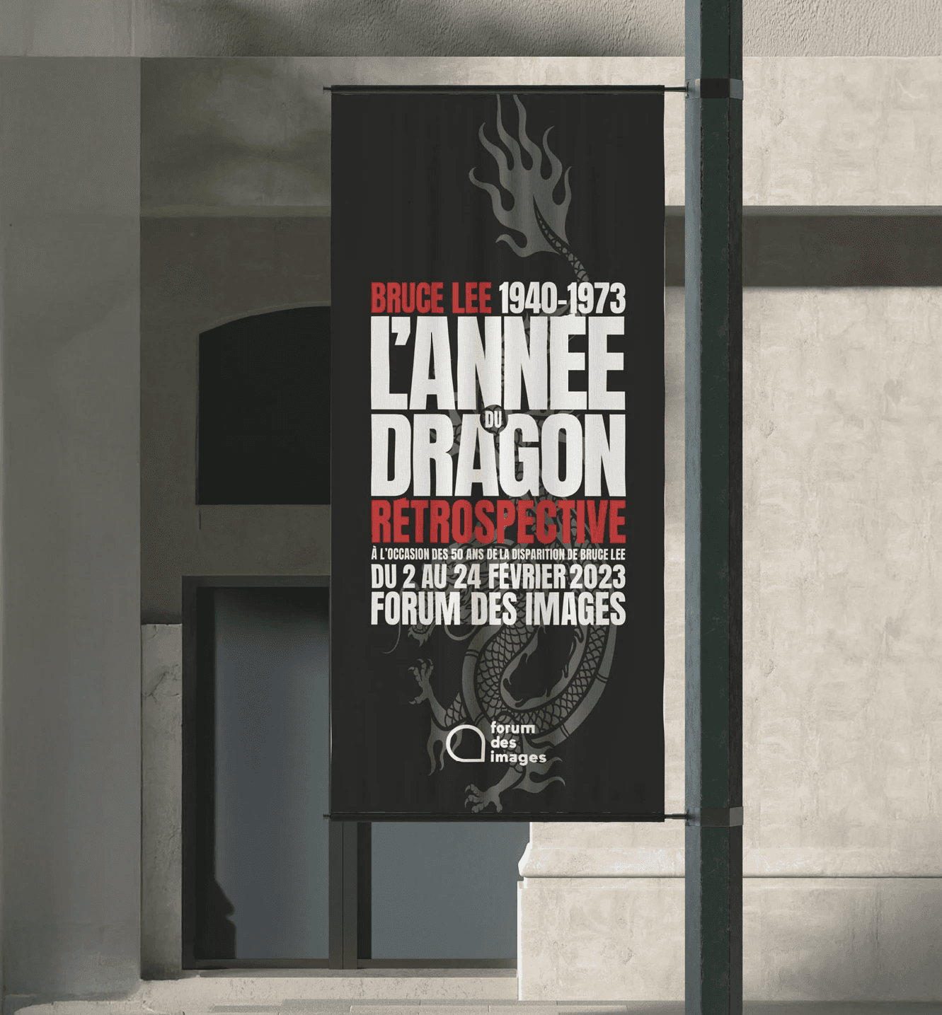 Une direction artistique événementielle puissante pour une rétrospective dédiée à une icône du cinéma et des arts martiaux.